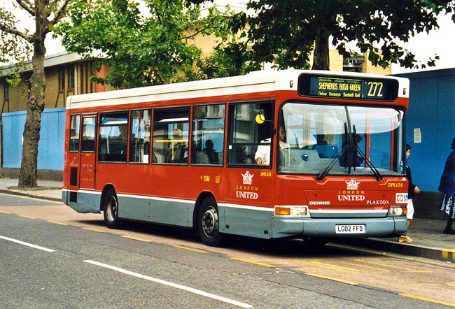 | Über 90 Prozent der 2.760 Londoner Midibusse sind niederflurige Dennis Dart SLF in verschiedenen Längen von 8,5 bis 10,8 Metern, davon annäherend 1.500 mit Aufbauten von Plaxton. London United setzt unter der Nummer DPK620 dieses 8,8 Meter lange Exemplar ein, das auf der Wood Lane in Shepherd's Bush fotografiert wurde. | ||