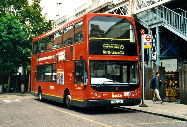 | Da die zahlreichen Londoner Busbetriebe verschiedene Kombinationen an Fahrgestellen, Aufbauten und Längenvarianten beschaffen, bieten die Londoner Busse heute ein sehr abwechslungsreiches Bild. Nur London Central und London General, die beide zur Go-Ahead Group gehören, beschafften bislang Volvo B7TL mit Aufbauten von East Lancs. Mit EVL8 von London General ist einer dieser Busse in dieser Aufnahme zu sehen. | ||