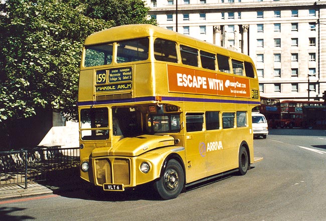 | Im Jahr 2002 erhielten zur Feier des Thronjubiläums von Königin Elizabeth II. 50 Londoner Busse eine goldene Lackierung. Die meisten wurden inzwischen wieder rot lackiert, RM6 von Arriva ist jedoch weiterhin in dieser Farbgebung unterwegs. Der 44 Jahre alte AEC Routemaster konnte an der Marble Arch aufgenommen werden. | ||