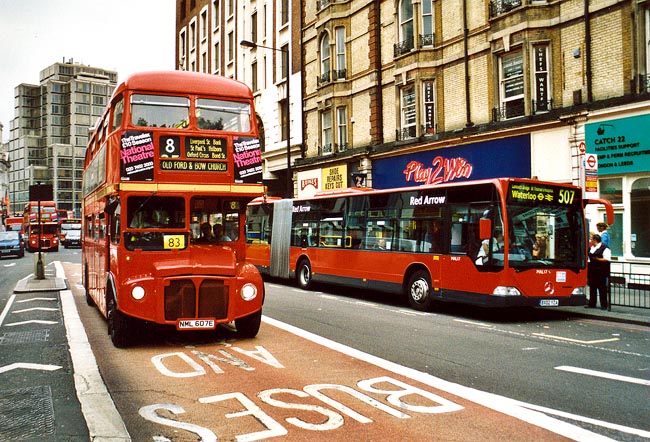 | Obwohl die AEC Routemaster bereits drei Generationen an Nachfolgebussen überlebt haben, scheint ihr endgültiges Ende bevorzustehen. Transport for London möchte die teilweise annähernd 50 Jahre alten Busse innerhalb der nächsten Jahre ausmustern - teilweise werden sie dabei durch Gelenkbusse ersetzt werden. 35 Jahre liegen zwischen RML2607 von Stagecoach East London und MAL17 von London General, die nebeneinander in der Victoria Street zu sehen sind. | ||