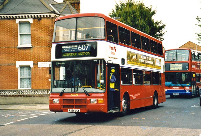 | Bis auf die kleineren Längenvarianten der Midibusse sind fast alle Londoner Busse zweitürig - eine Ausnahme sind dabei die Volvo Olympian mit Northen Counties-Aufbau, die First in London auf dem Schnellbus 607 einsetzt. Einen dieser Busse, V55, zeigt das Foto an der Endhaltestelle in Shepherd's Bush. | ||
