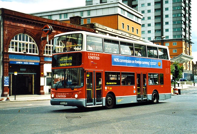 | Viele in London eingesetzte Volvo B7TL haben Aufbauten, die vom schottischen Hersteller Alexander - mittlerweise von TransBus übernommen - gefertigt wurden. Das Foto zeigt mit VA303 von London United ein Fahrzeug dieser Kombination auf der Westminster Bridge Road. | ||