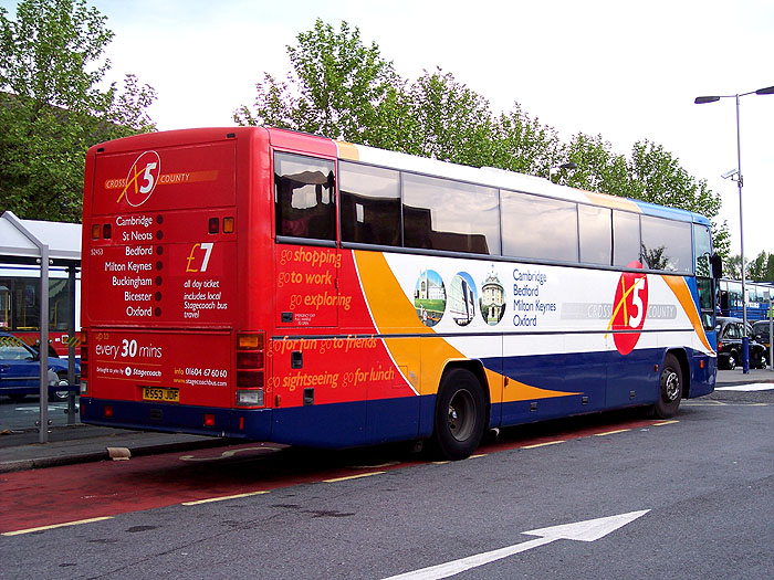 | Die Linie X5 zwischen Cambridge und Oxford über Bedford und Milton Keynes wird angesichts ihrer Fahrzeit von 4 Stunden pro Richtung mit Reisebussen betrieben. Diese bieten auf ihren Außenflächen Platz, um das Angebot der Linie zu berwerben, was am Heck neben Linienweg und Taktfrequenz auch mit dem Hinweis auf den Preis einer Tageskarte geschieht, während an den Seiten Anregungen zu Fahrtzweck und Sehenswürdigkeiten überwiegen. | ||