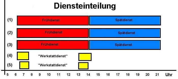Diensteinteilung für den Beispielbetrieb. Auch hier sind bereits die Wagen 4 und 5 enthalten,die im Abschnitt "Probleme des Schüler- und Berufsverkehrs" erläutert werden.