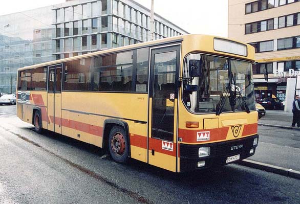 | Abschließend noch ein Österreich-typischer Hersteller: Bei dem Wagen 14707 des PostBus handelt es sich um einen Steyr/Volvo SL 12 HUA 285. Die Aufnahme entstand am 30.12.2000 am Hauptbahnhof in Innsbruck. |