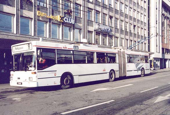 Neben zehn niederflurigen O-Bussen bestreiten die Hochflur-O-Busse des Typs Gräf & Stift GS GE 152 M18 den Verkehr auf den elektrifizierten Linien. Der bereits in den neuen Unternehmensfarben der IVB lackierte Wagen 815 ist hier am Hauptbahnhof Innsbruck zu sehen. |