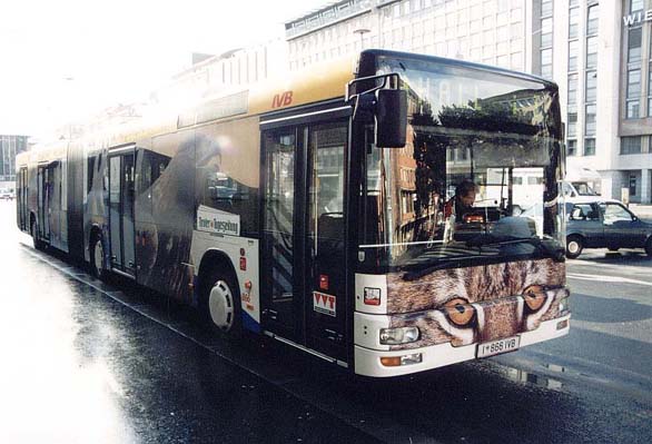 Auch in Innsbruck haben inzwischen Omnibusse der neuen Generation Einzug gehalten. Der Wagen 866, ein MAN A23, steht am 30.12.2000 am Innsbrucker Hauptbahnhof. Man beachte die auffällige Vollwerbung. |
