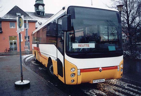 Bei dem PostBus-Wagen 38014 handelt es sich um einen Renault Ares. Die Aufnahme zeigt das Fahrzeug am 29.12.2000 in Garmisch-Partenkirchen am Bahnhof. Er wird als Schienenersatzverkehr für den ruhenden Personenverkehr auf der Außerfernbahn nach Reutte in Tirol eingesetzt. |