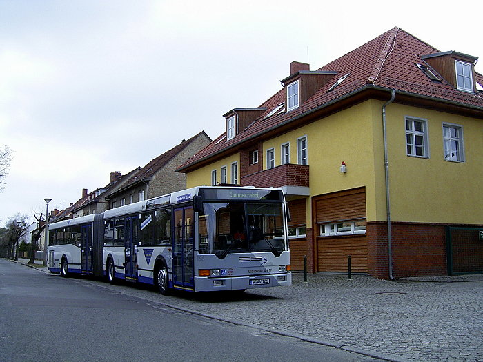 Wagen 166 vor dem ehemaligen Obus-Depot in der Stephensonstraße.Das Gebäude wird heute als Polizeiwache genutzt.