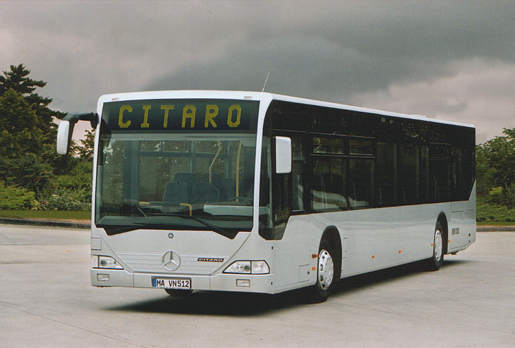 Die Fahrerseite des Niederflur-Überlandbusses, markantes äußerliches Merkmal ist der verlängerte Achsstand.(Aufnahme: DaimlerChrysler)