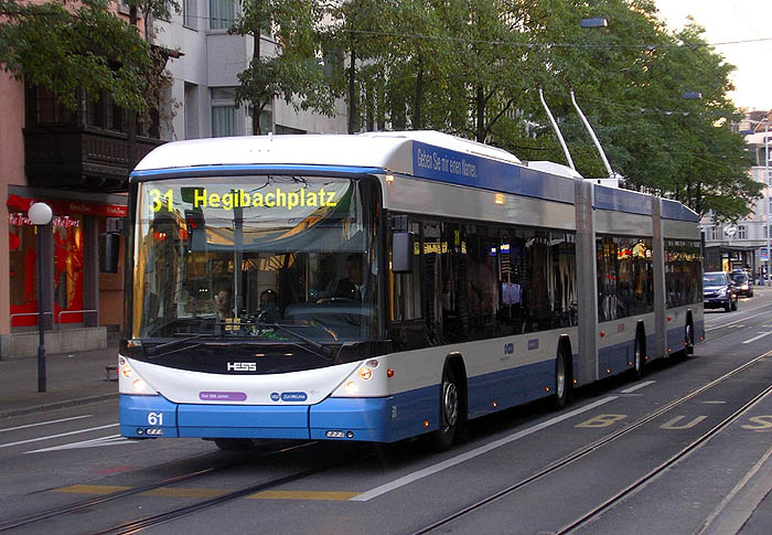 | Der lighTram Hybrid basiert auf dem Doppelgelenk-Oberleitungsbus lighTram Trolley, der hier in der Zürcher Ausführung zu sehen ist. Wagen 61 der Verkehrsbetriebe Zürich zeigt sich im Einsatz als Linie 31 am Bahnhofplatz. | ||
