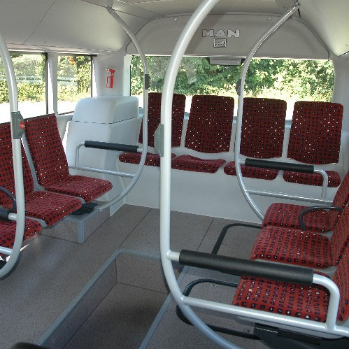 Der Heckbereich des Innenraumes mit Konferenzbestuhlung. Die Sitzpolster der Rückbank sind in das