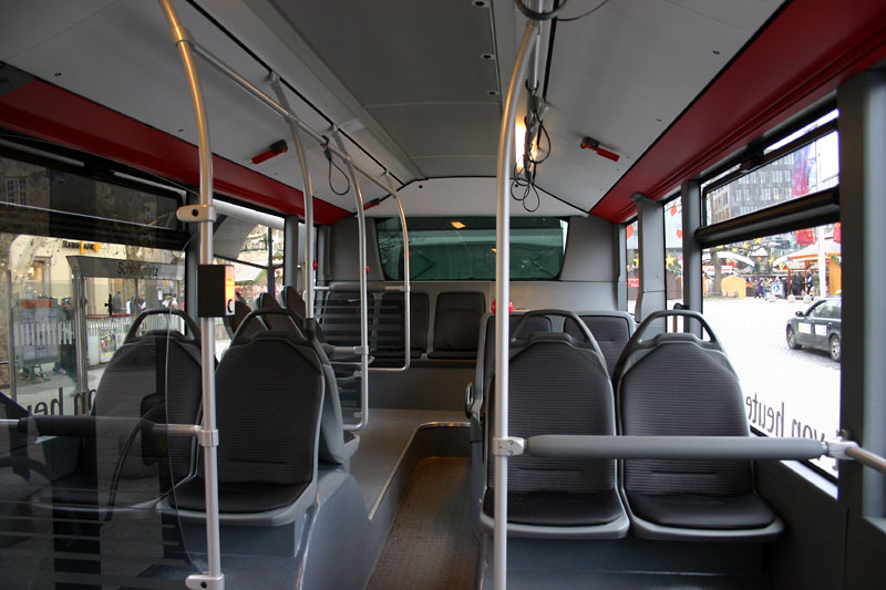 Das Heck im Innenraum: Der Dieselmotor ist hinten links (in Fahrtrichtung gesehen) angeordnet und mit einem nur halbhohen Kasten überbaut - der bietet freien Durchblick, ermöglicht aber keine Sitze und führt zu einem recht engen Gang. (Aufnahme: Sven Peters) | ||