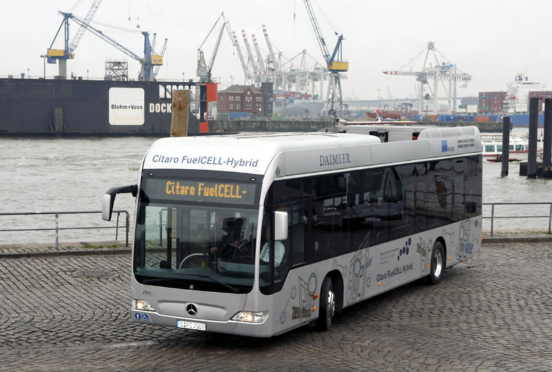 Der neue Citaro FuelCell Hybrid - die Kombination aus Brennstoffzellenantrieb und Hybridsystem - bei einer Vorstellung in Hamburg. Dort werden ab 2010 die ersten zehn Busse dieser Bauart im Liniendienst fahren. (Aufnahme: Daimler) | ||