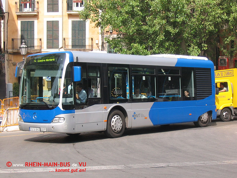 Nach zwei EvoBus MB O 520 (Cito) aus dem Dezember 2000 verstärkten die Wagen 302 bis 311 erst ab September 2001 den Fuhrpark. Äußerlich unterschieden sie sich von den beiden älteren Fahrzeugen nur durch den „Cito - Bus of the year 2000“-Aufkleber, wie am Placa Reina Wagen 303 vor Augen führt. | ||