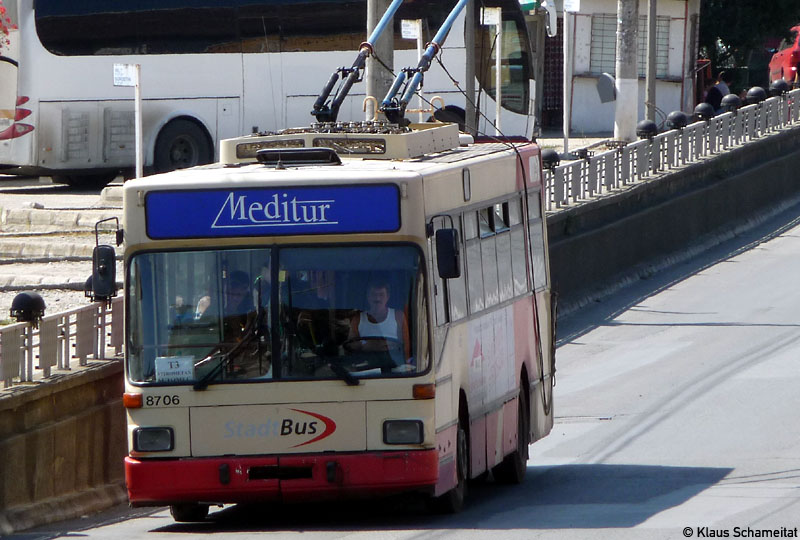 Mediaş: Obus 655 (ex Salzburg 8706) nähert sich der Brückenrampe beim Bahnhof.