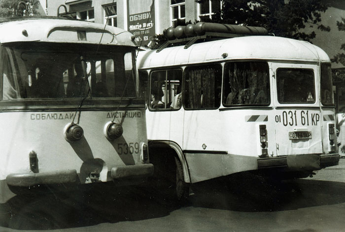Ukraine - Jalta/Krim (2003): KAvZ mit Gasanlage auf dem Dach neben Skoda-Obus 9Tr.