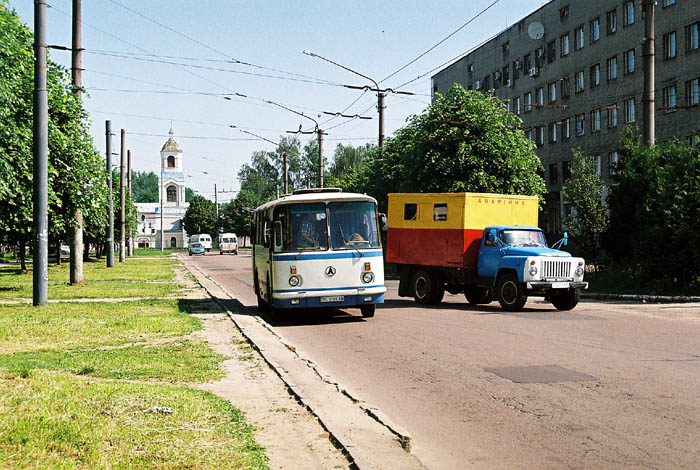 Ukraine - Lviv (2007): LAZ 695 aus der örtlichen Autobusfabrik Lviv neben einem Werkstattwagen.