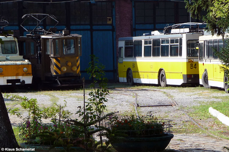 Depot Take Ionescu: Neben zwei historischen Arbeitsfahrzeugen stehen die ausgemusterten Obusse Nr. 84 (ROCAR) und 20 (Berliet).
