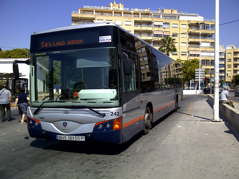 Im spanischen Torrevieja an der Costa Blanca sind neulich drei neue Low-Entry-Busse des Typs Noge Cittour LE eingetroffen. Die Linienbusse basieren auf einem Scania-Fahrwerk und sind mit den Wagennummern 242 bis 244 in den Fuhrpark eingereiht. Das Bild zeigt den Wagen 242 an der Endhaltestelle "Eras de la Sal".
