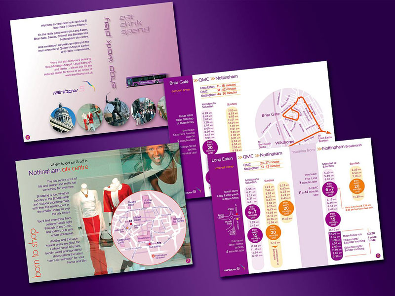 Die Aufnahmen von TrentBarton zeigen zunächst links die alte Lackierung der Linie Rainbow5, in der Mitte das neue Designkonzept sowie rechts das entsprechende Werbematerial für diese Linie.