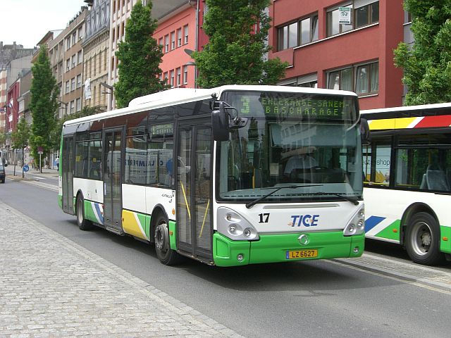Der Zweckverband TICE, der den ÖPNV im südluxemburgischen Montanrevier um Esch-sur-Alzette betreibt, hat sieben Irisbus Citelis mit EEV-Motoren in Betrieb genommen. Die Wagen tragen die Nummern 11 bis 17 und die Kennzeichen LZ 6621 bis 6627. Es handelt sich dabei um die ersten Busse aus dem Hause Irisbus beim TICE. Das Bild zeigt den Wagen 17 am Bahnhof von Esch.