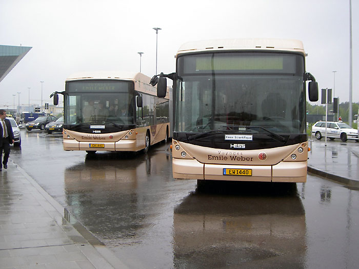Auf einer Pressekonferenz am 11.05.2009 auf dem Luxemburger Flughafen Findel übergab der Schweizer Bushersteller Hess aus Bellach bei Solothurn die beiden ersten Serienfahrzeuge seines Doppelgelenk-Hybridbusses "lighTram 3" an die Firma Voyages Emile Weber aus dem luxemburgischen Canach. Die beiden Wagen wurden auf die Kennzeichen EW 1440 und EW 1441 zugelassen. Zum Einsatz kommen werden sie im Linienverkehr im Auftrag des Luxemburger Stadtverkehrsbetriebs AVL (Autobus de la Ville de Luxembourg) auf dessen Linie 16 (Flughafen - Stadtmitte - Hauptbahnhof - Hesperange). Die beiden Fotos zeigen die Fahrzeuge bei der Präsentation am Flughafen.