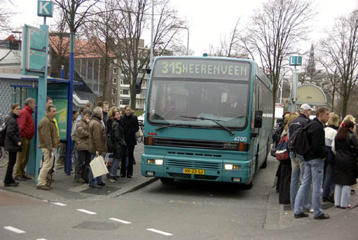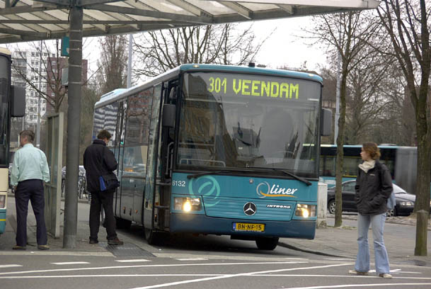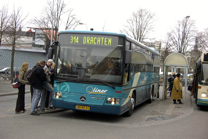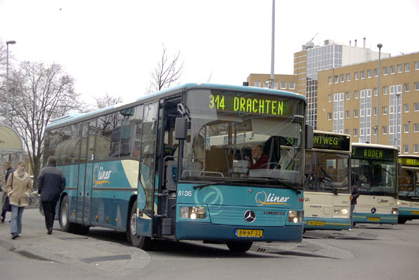 Gleichfalls am 01. Januar 2003 wurden die "Aggloliner"-Linien (506, 507/517 und 518) umgenannt in "Q-Liner", und auch die "Interliner"-Linien 300, 301, 310, 314 und 315 wurden "Q-Liner". Zur Zeit wird eine Serie EvoBus MB O 550 (Integro) mit Nummern 6130 und weiter abgeliefert und in Dienst gestellt. Zum Teil werden diese Fahrzeuge im "DAV"-Gebiet eingesetzt, auch im "hohen Norden" sind die 6100er schon im Einsatz. Die Aufnahmen zeigen zunächst die neuen Wagen 6132 sowie zweimal Wagen 6136, auf dem rechten Bild ist Wagen 4700 im Einsatz auf der neuen Q-Liner-Linie 315 in Groningen am ZOB zu sehen. Alle Aufnahmen entstanden am 19.03.2003.