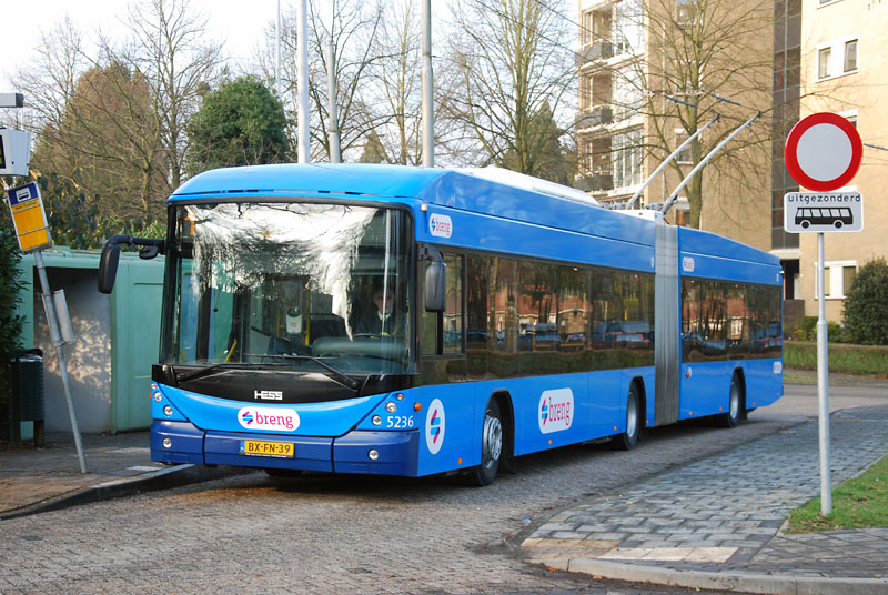 Für den Trolleybusbetrieb in der niederländischen Stadt Arnhem hat breng, der Betriebszweig für die Region Arnhem/Nijmegen des Verkehrsunternehmens Connexxion (Tochter des französischen Verkehrskonzerns Transdev), Ende 2009 neun Niederflur-Gelenktrolleybusse des Schweizer Herstellers Hess vom Typ BGT-N 2 C erhalten. Sie erhielten die Wagennummern 5231 bis 5239. Die Wagen entsprechen im Wesentlichen den Bussen desselben Typs in Solingen, haben aber andere Diesel-Notfahraggregate - die allerdings wie auch bei den Solinger Wagen vom Trierer Hersteller Kirsch geliefert wurden. Das linke Bild zeigt den Wagen 5236 am 20.01.2010 in Oosterbeek, Station.