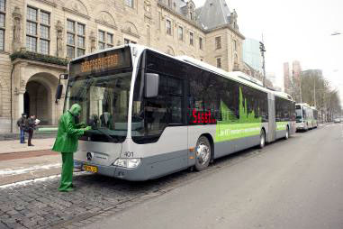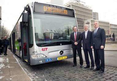 Am 13.01.2010 trafen die zwei nagelneuen EvoBus MB O 530 G BlueTec Hybrid (Citaro) in Rotterdam ein. Rotterdam ist nach Stuttgart die zweite Stadt, die dieses Modell in Betrieb nimmt. Die zwei Bilder von EvoBus zeigen den Wagen 401 bei der feierlichen Übergabe. Die Citaro-Hybridbusse können dank des seriellen Hybridantriebs emissionsfrei und rein elektrisch fahren.