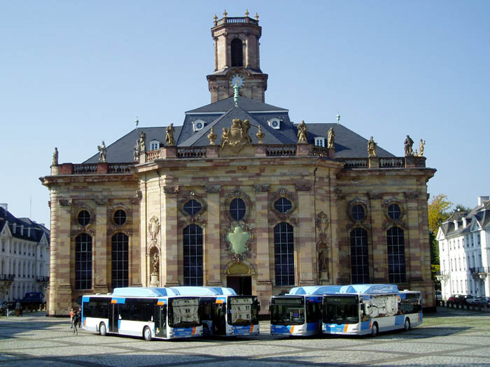 Die NEOMAN Bus Gruppe hat insgesamt acht MAN Lion's City CNG an die kommunalen Verkehrsbetriebe der Stadtbahn Saarbrücken ausgeliefert. Thomas Hartmann, Geschäftsführer der NEOMAN Bus Vertrieb GmbH Deutschland, übergab die Fahrzeuge vor der Ludwigskirche an Prof. Dr. Franz Heinrich, Geschäftsführer der Stadtbahn Saarbrücken und Charlotte Britz, Oberbürgermeisterin von Saarbrücken.