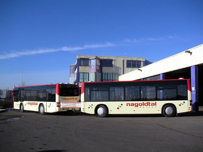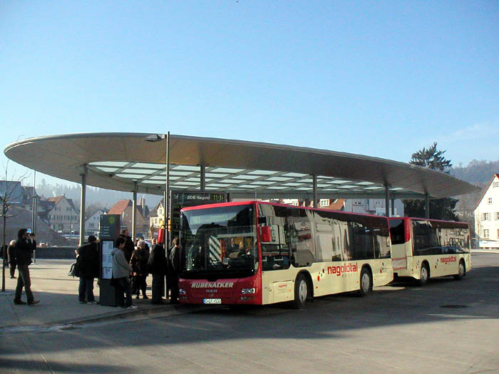 Seit Anfang Januar prägen zwei neue Busse das Stadtbild von Nagold: Midibusse mit Anhänger, sogenannte Miditrains, befördern im Stadtverkehr die Fahrgäste in einem optisch noch ungewohnten Fahrzeug. Die NEOMAN Bus GmbH gewann zusammen mit der Markus Göppel GmbH & Co. KG eine entsprechende Ausschreibung der Firmengruppe Rübenacker und übergab nun die ersten beiden Miditrains an die Geschäftsführer Karl und Thomas Rübenacker. Ebenfalls anwesend waren Dr. Rainer Prewo, Oberbürgermeister der Stadt Nagold, und Roland Bernhard, erster Landesbeamter des Landkreises Calw.