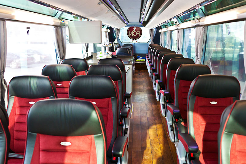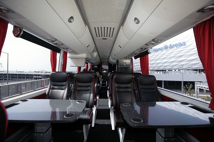 Die exklusive Innenausstattung, die nach Wünschen des Buseigners und des 1. FC Nürnberg zu großen Teilen mit Systempartner Frenzel realisiert wurde, geht weit über den bereits üppigen Serienumfang hinaus und bietet alles, was das Sportlerherz begehrt. Insgesamt 30 hochwertige Fahrgast-Ledersitze sind in exklusiver 2 + 1 Anordnung mit einer Vis-a-vis Sitzgruppe positioniert. Im riesigen Kofferraum mit insgesamt 13 m3 finden auch alle Utensilien vom Trikotkoffer bis zu den Massageliegen für Auswärtsbegegnungen Platz. In der großzügigen Küche mit zwei Warmluftöfen können fertige Gerichte analog zum Bordservice in Flugzeugen zubereitet werden. Mehrere Kühlschränke ergänzen die Verpflegungslogistik. Digitaler DVB-T Fernseh-Empfang und eine aufwändige Multimedia-Anlage mit zwei 19-Zoll Monitoren und einem 23-Zöller bieten Highend-Entertainment. Ein bordeigenes W-LAN Netz sorgt für individuellen Internetzugang.