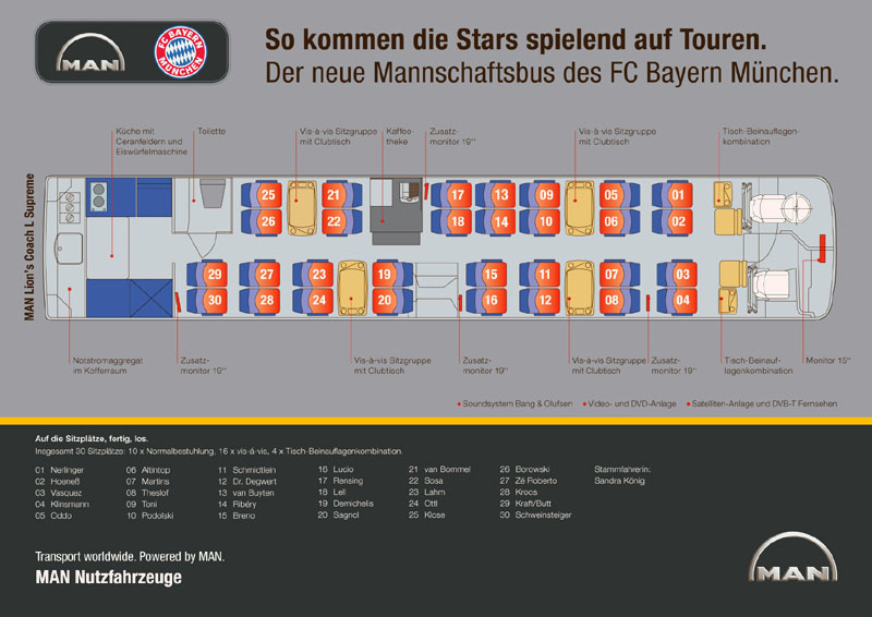 Der neue Mannschaftsbus vom Typ Lion`s Coach L, der von Autobus Oberbayern zur Verfügung gestellt wird, ist ein Gefährt für Sieger: Er wird von 440 PS angetrieben und verfügt über 55 Sitzplätze. Mit einer Länge von 13,8 m bietet der Bus viel Beinfreiheit und damit höchsten Komfort auf der Fahrt zum Auswärtsspiel. Ein Trennvorhang ermöglicht einen separaten Rückzugsort sowohl für Spieler als auch den Trainerstab, zudem können an einem Tisch Besprechungen stattfinden.