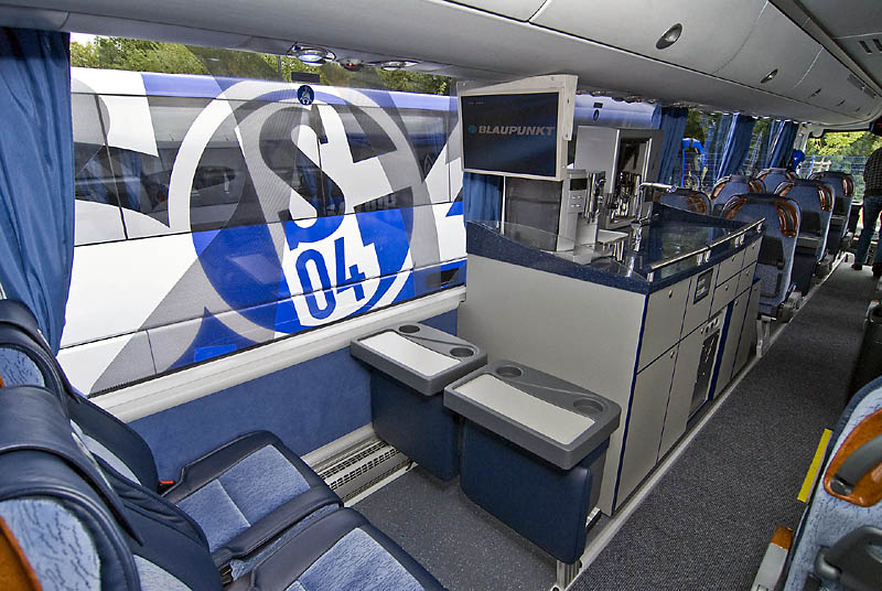 Die exklusive Innenausstattung, die nach Wünschen des SV Werder Bremen zu großen Teilen mit Systempartner Frenzel realisiert wird, geht weit über den bereits üppigen Serienumfang hinaus und bietet alles, was das Sportlerherz begehrt. Von den insgesamt 36 hochwertigen Ledersitzen sind acht in zwei Vis-a-vis Sitzgruppen mit Tischen in der Mitte angeordnet, 12 Plätze verfügen über eine Tisch-/Beinauflagenkombination und vier Sitze sind als Trainerarbeitsplätze ausgeführt. Digitaler DVB-T Empfang und eine aufwändige Multimedia-Anlage sind bei Mannschaftsbussen natürlich selbstverständlich. Mehrere Küchen und Kühlschränke stehen für einen komfortablen Bordservice.