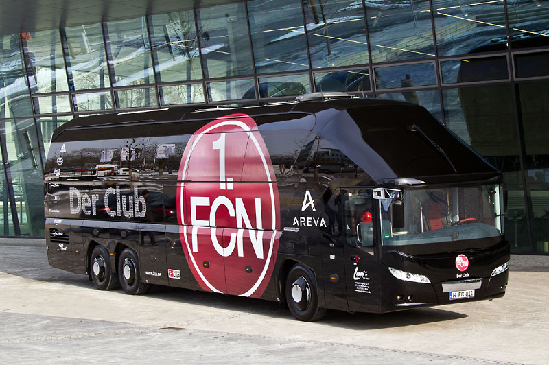 Der Starliner L, ist das Flaggschiff unter den Reisehochdeckern aus dem Hause NEOPLAN. Ausgezeichnet mit dem Titel „Coach of the Year 2006" gilt er weltweit als Design-Ikone im Segment Fernreisebusse. Mit rund 14 Metern Länge bietet der Dreiachser den Profis des 1. FC Nürnberg Komfort im XXL-Format. Für den kraftvollen Antrieb sorgt ein effizienter 505 PS MAN Common Rail-Motor, der mit der MAN PURE DIESEL®-Technologie die geforderten EEV-Emmissionsgrenzwerte ohne Additive erfüllt. Ein automatisiertes 12-Gang Schaltgetriebe MAN TipMatic® überträgt die Leistung an die Antriebachse.