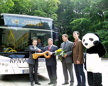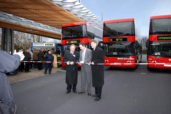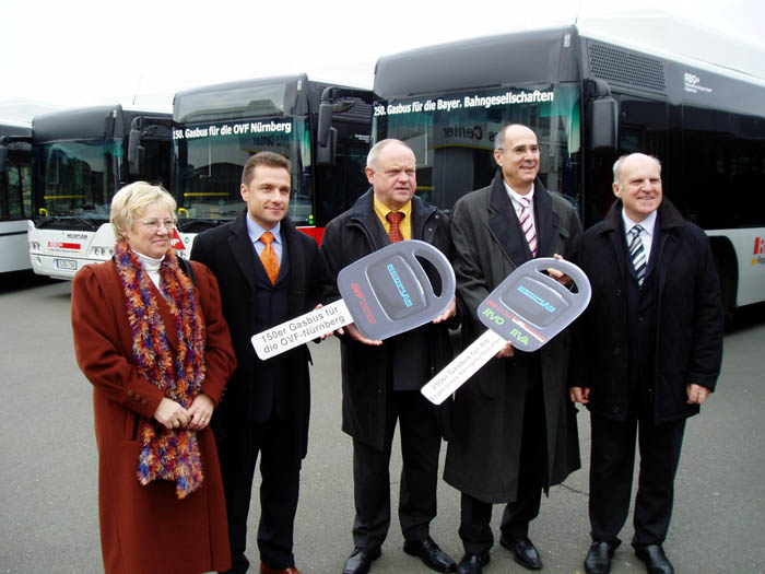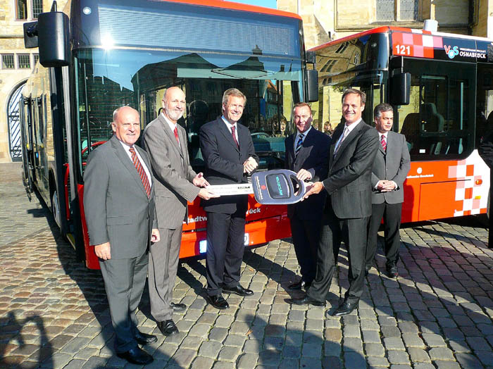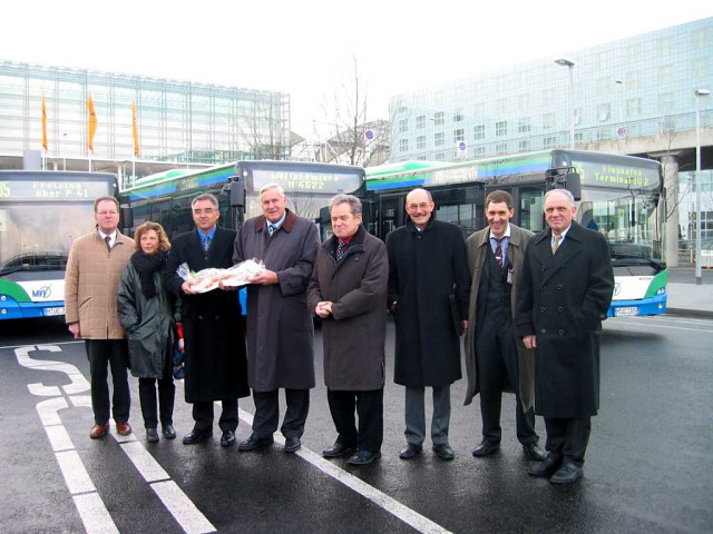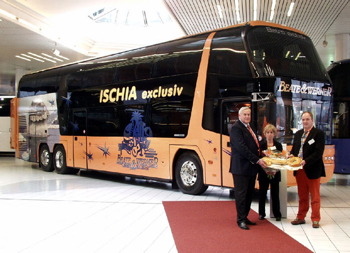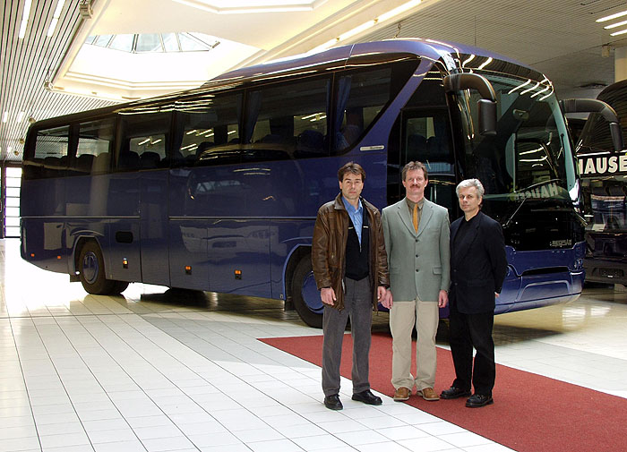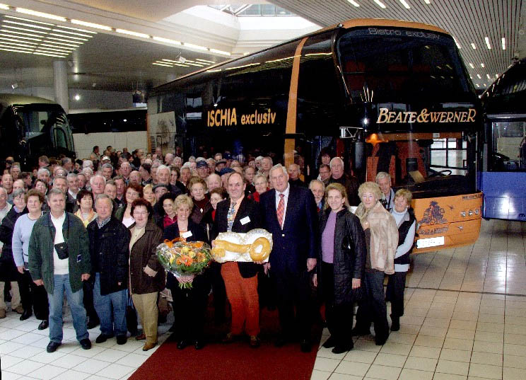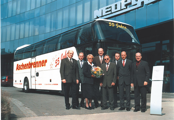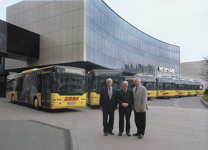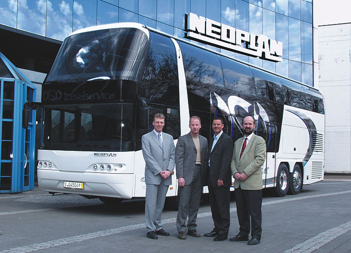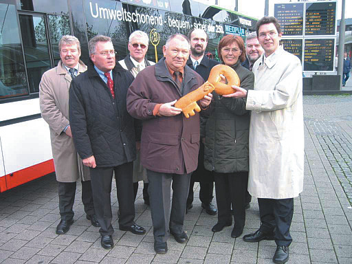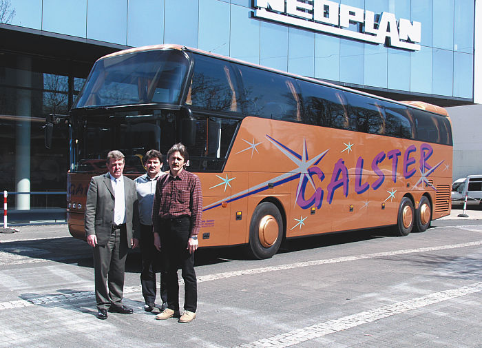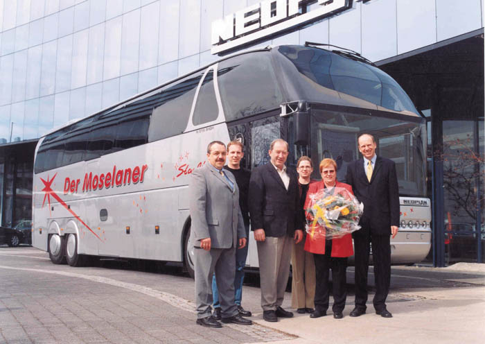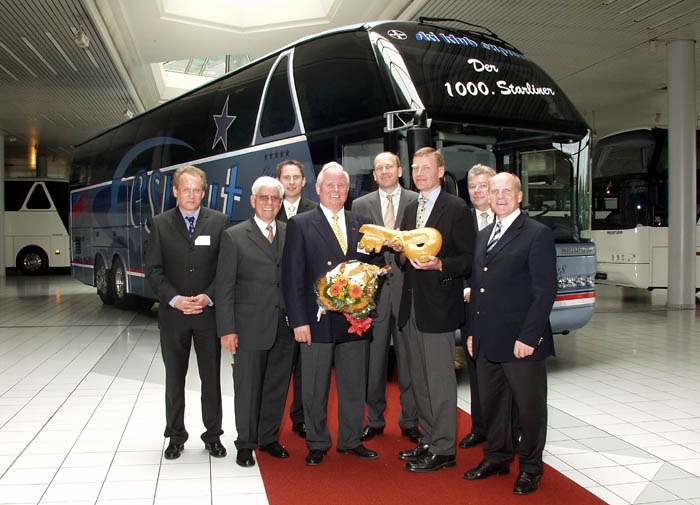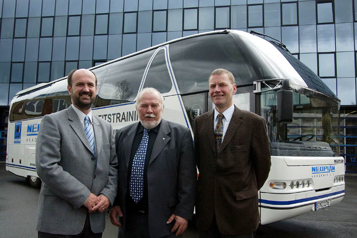 Ernö Bartha (Vorsitzender der Geschäftsleitung der NEOPLAN Bus GmbH), Walter Becker (Vertriebsleiter ÖPNV), Hans Joachim Nötzel (Geschäftsführer NEOPLAN Rhein-Ruhr) und Karl Binder (Werkleitung Pilsting) übergeben das in Pilsting gebaute Fahrzeug feierlich an Martin Schmidt, Geschäftsführer der Vestischen Straßenbahnen GmbH, und Friedbert Hückelkamp, stellv. Aufsichtsratsvorsitzender der Vestischen Straßenbahnen GmbH.