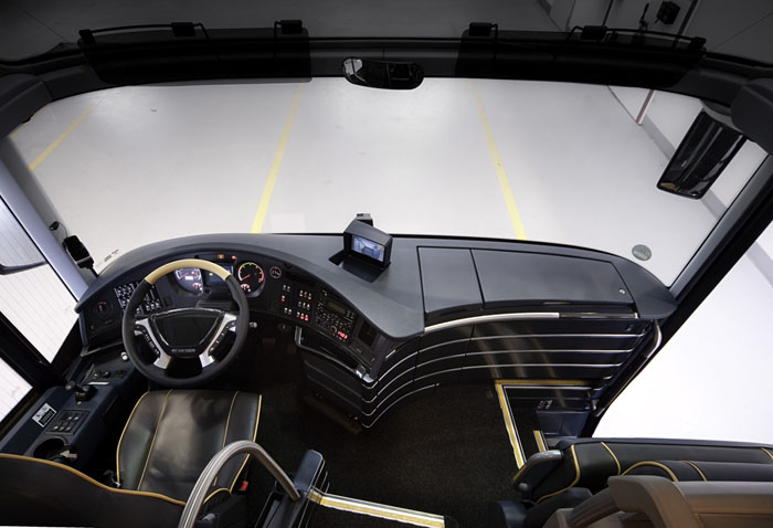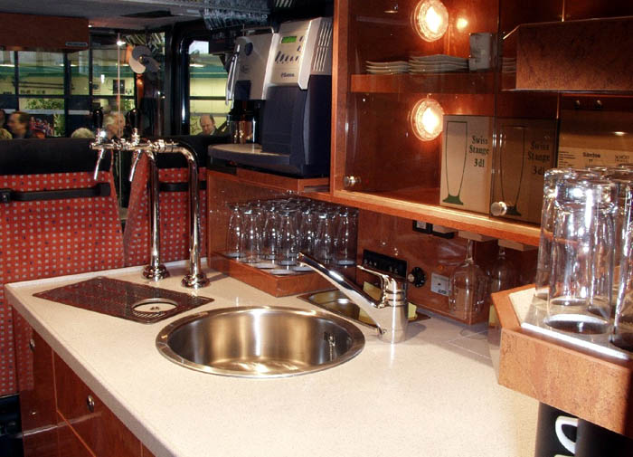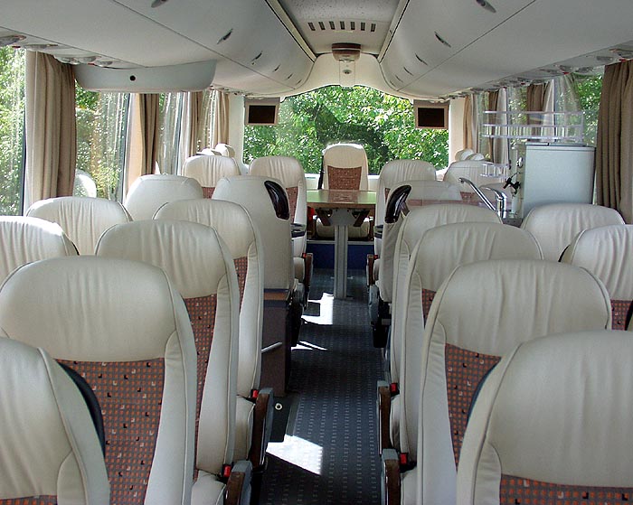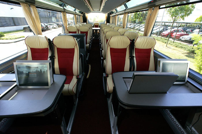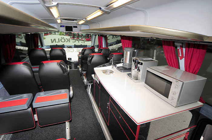 Die Innenausstattung, die zu großen Teilen mit Systempartner Frenzel realisiert wurde, geht weit über die bereits umfangreiche Serie hinaus und bietet alles, was das Sportlerherz begehrt. Dazu zählen drei versenkbare Tische mit elektrisch verstellbaren Beinauflagen, 32 komfortable Sitze im Fußballdesign mit Lederkopfteilen mit eingelasertem Vereinslogo sowie unzählige Multimediaeinrichtungen, wie zum Beispiel ein Premium-Soundsystem mit Achtkanalanlage an jedem Sitzplatz, fünf 17-Zoll TFT-Bildschirme, DVD-Anlage und W-LAN Vorbereitung. Satelliten-TV ist bei Mannschaftsbussen selbstverständlich, hier in Verbindung mit einer besonders flachen DVB-S Anlage mit Premiere-Empfang. Die großzügige Küche mit extra-großem 120 Liter-Kühlschrank lässt auch für den gesunden Bordservice keinerlei Wünsche offen. Ein Lade-Wechselrichter sowie Steckdosen an jedem Sitzplatz sorgen für permanente Entertainment-Möglichkeiten für jeden Spieler.