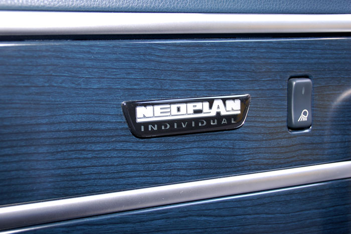 Die unter der Marke „NEOPLAN individual" realisierten Fahrzeugkomponenten werden durch ein entsprechendes Logo dokumentiert. Auf den ersten Blick sind die so veredelten Fahrzeuge im Einstiegsbereich durch die verchromten Querfugen des Bugschranks vor dem Begleitersitz zu erkennen, die auf Anhieb eine hochwertige Optik vermitteln.