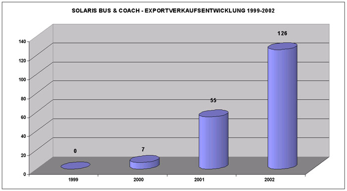 Wie schon in den letzten Jahren, war auch im Jahr 2003 die Exportsteigerung für Solaris Bus & Coach von sehr großer Bedeutung und brachte eine Steigerung des Auslandsverkaufs um 34%. Der Anteil des Exports am Gesamtverkauf der Firma ist von 52% im Jahr 2002 auf 60% im Jahr 2003 gestiegen. Sein Anteil am