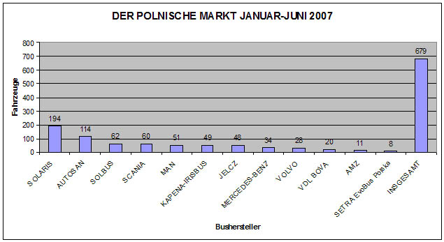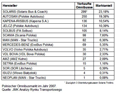 Mit 103 im Jahr 2003 verkauften Bussen (davon 97 Stadtbusse) hat Solaris Bus & Coach über 30% Marktanteil in Polen erreicht und damit die Position des Marktführers erzielt. Die Anzahl der Ausschreibungen für Stadtbusse ist gering. Grund dafür ist der Sparzwang in vielen polnischen Gemeinden, die mit jedem Cent