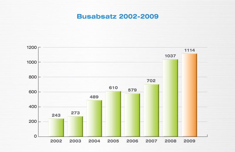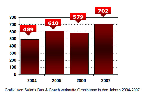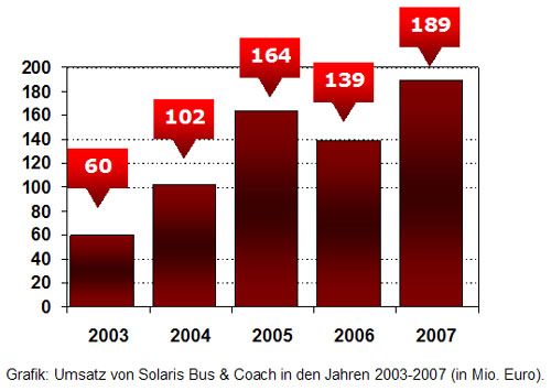 2011 war erneut ein Erfolgsjahr für Solaris. Ein erneutes Absatzplus konnte das nachhaltige Wachstum deutlich fortsetzen. Bei einer Absatzsteigerung von 8 Prozent wurden exakt 1.205 neue Busse an Kunden in ganz Europa verkauft (2010: 1.120 Busse). Gleichzeitig begann die Serienlieferung der modernen Niederflurstraßenbahn Solaris Tramino. Der Umsatz der Solaris Bus & Coach S.A. kletterte im abgelaufenen Jahr um 17 Prozent auf den neuen Rekordwert von 370 Mio. EUR (2010: 316 Mio. EUR - Umrechnung aus Bilanzwährung PLN entsprechend Jahresmittel-Wechselkurs 2011 der Polnischen Nationalbank).