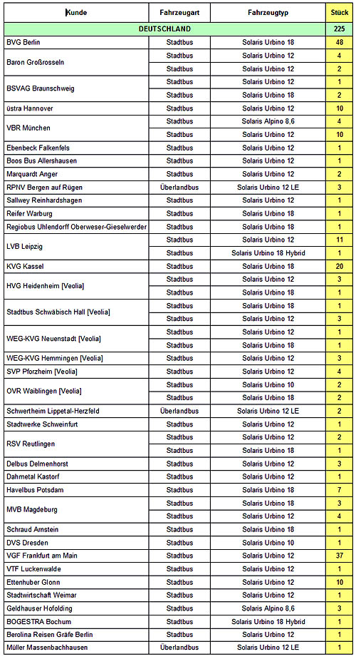 Weitere bedeutende Absatzmärkte waren im Jahr 2011 Frankreich mit 149 neuen Solaris-Bussen (2010: 54 Busse) und Skandinavien mit 140 Bussen (2010: 304 Busse).