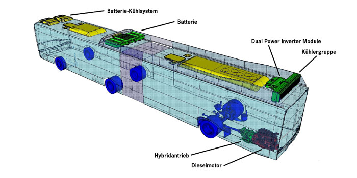 Über einen Plug-in-Anschluss werden die Batterien im Depot extern geladen. Im Fahrzeug erzeugt ein volumenreduzierter Cummins-Dieselmotor nach EEV-Abgasnorm über einen angeschlossenen Generator elektrische Energie. Der Antrieb an der Achse erfolgt rein elektrisch über einen 250 kW starken Zentralmotor. Ein GPS-gestütztes Energiemanagement passt das Zusammenspiel der Komponenten exakt auf die jeweilige Einsatzroute an und maximiert so das Einsparpotential.