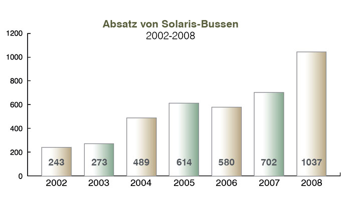 Umsatz ist entsprechend von 56% im 2002 auf 70% im Jahr 2003 gewachsen. Zu den größten Abnehmern der Firma gehörten auch im letzten Jahr Deutschland, Lettland und Tschechien. Besonders bemerkenswert ist der Erfolg des polnischen Busherstellers auf den Märkten von Westeuropa, die traditionell von Großkonzernen dominiert werden. Auf dem deutschen Markt, wo sich die Unternehmen EvoBus und NEOMAN 96% des Marktes teilen, erringt Solaris Bus & Coach nun immer größere Akzeptanz. Von den restlichen 4% der Marktanteile hat Solaris Bus & Coach den größten Teil. Ein weiterer Erfolg der Solaris Bus & Coach war im vergangenem Jahr der Verkauf ihrer Produkte in der Schweiz, in Italien, Frankreich, und Schweden. Einer besonders großen Nachfrage erfreuten sich die Trolleybusse. 30 Fahrzeuge dieses Typs hat Rom (Italien) für sein neu ausgebautes Oberleitungsnetz bestellt. Weitere 100 Solaris Trolleybusse wurden nach Riga