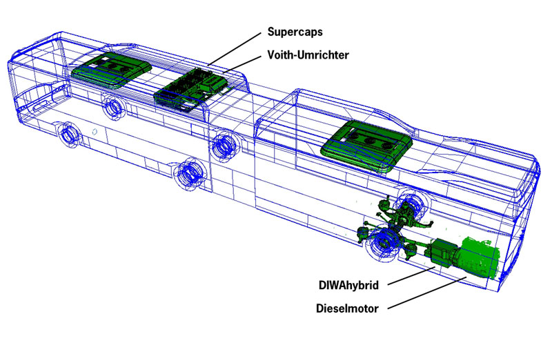 Die während des Bremsvorgangs zurück gewonnene Energie wird in einem nur 410 kg schweren Supercap-System gespeichert. Die fünf 125-V-Module haben eine Speicherkapazität von insgesamt 0,5 kWh. Um die Platzverhältnisse im Fahrgastraum nicht zu beeinträchtigen sind die Supercaps ebenso wie der Voith-Umrichter auf dem Fahrzeugdach angeordnet. Elegante Dachverkleidungen weisen auf die zukunftsweisende Antriebstechnik des Urbino 18 DIWAhybrid hin.