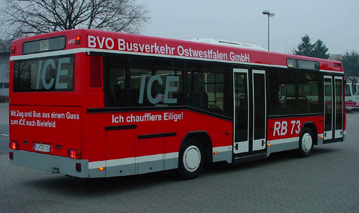 Im neuen Lack präsentiert sich der Wagen LIP-DT 713, ein Neoplan N 4010, der BVO Busverkehr Ostwestfalen GmbH der Geschäftsstelle Detmold. Der Wagen war ursprünglich für den Stadtverkehr in Detmold angeschafft worden. Er verkehrt seit dem 15.12.2002 als Shuttle zwischen Lemgo und Lage, wo er Anschluss an den RegionalExpress nach Bielefeld herstellt. Das Zug-Bus-Angebot sichert den Bewohnern Lemgos einen zeitnahen Anschluss an den ICE in Bielefeld. Die Lackierung ist den Nahverkehrstriebwagen der Deutschen Bahn nachempfunden.
