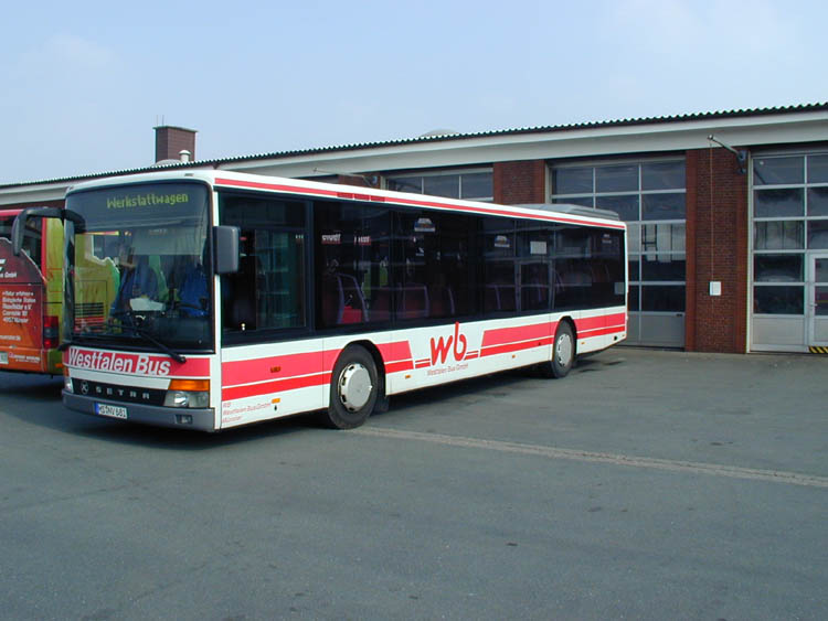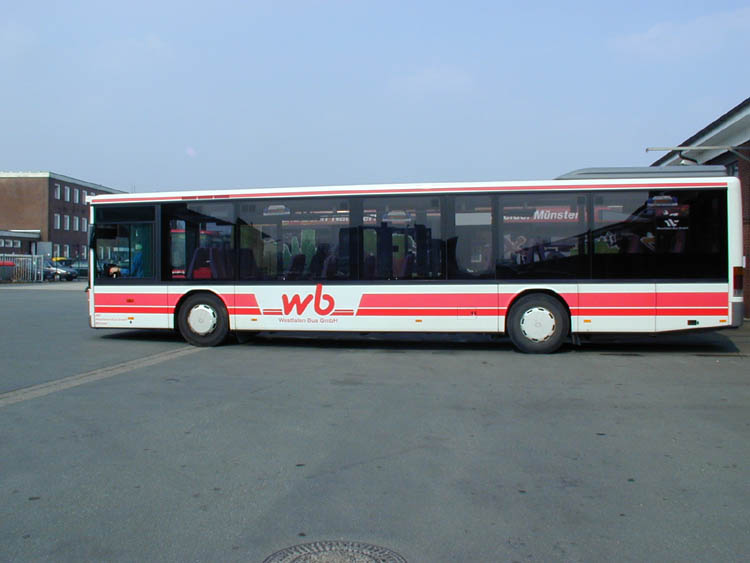 In Münster ist ein erster Bus der WB Westfalen Bus GmbH mit dem neuen Logo beklebt worden, das seit Anfang des Jahres für das Unternehmen steht. Mit dem neuen Logo soll nach außen sichtbar gemacht werden, dass die in Westfalen tätigen Bustöchter der DB Regio AG (BVO Busverkehr Ostwestfalen, BBH BahnBus Hochstift und BRS Busverkehr Ruhr-Sieg) in Zukunft noch stärker zusammen arbeiten, um dem Fahrgast ein optimales Nahverkehrsangebot bieten zu können. Neben der schwungvollen Form fällt auf, dass der gelbe "Regionalstreifen" einem roten gewichen ist. Der Wagen MS-NV 381 wurde Anfang April im Betriebshof Münster aufgenommen. Die weiteren rund 50 Fahrzeuge werden in den kommenden Wochen beklebt.