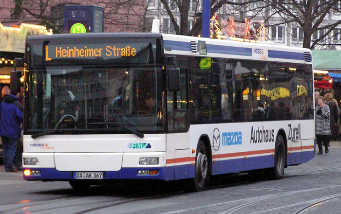 Wie bereits im Oktober gemeldet, wurde der Verkehrsbereich der HEAG in Darmstadt neu geordnet. Zwischenzeitlich wurden die Omnibusse der nunmehrigen HEAG mobiBus GmbH & Co. KG mit neuen Logos versehen, wobei die angebrachten Betriebsnummern entfielen. Die Aufnahme zeigt beispielhaft den MAN A21 mit der Nummer 367.