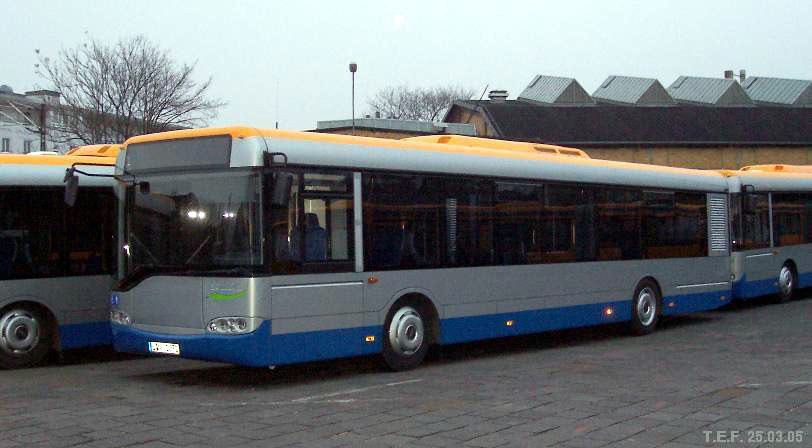Pünktlich zu Ostern wurden der LVB die sieben werksneuen Solaris Urbino 12 in "Silberpfeil"-Lackierung "ins Nest gelegt". Die Wagen sind am 25.03.2005 bereits mit Kennzeichen versehen (L-NV 1070 bis 1076, d.h. Wagennummern 70 bis 76), wurden aber noch nicht komplettiert und endabgenommen. Ausgerüstet sind die Urbinos u.a. mit Dieselrußfilter, Klimaanlage und Infotainment. Nach Inbetriebnahme soll die ensprechende Anzahl MAN NL 202 der Erstzulassung 06.1992 außer Dienst gestellt werden. Bereits betroffen ist der erste Wagen dieser Serie (Wagen 150, L-NV 1150), der im Januar an die Tochter RVL als L-VR 5186 abgegeben wurde. Das Foto zeigt den neuen Wagen 72 am Abend des 25.03.2005 im Betriebshof Lindenau.